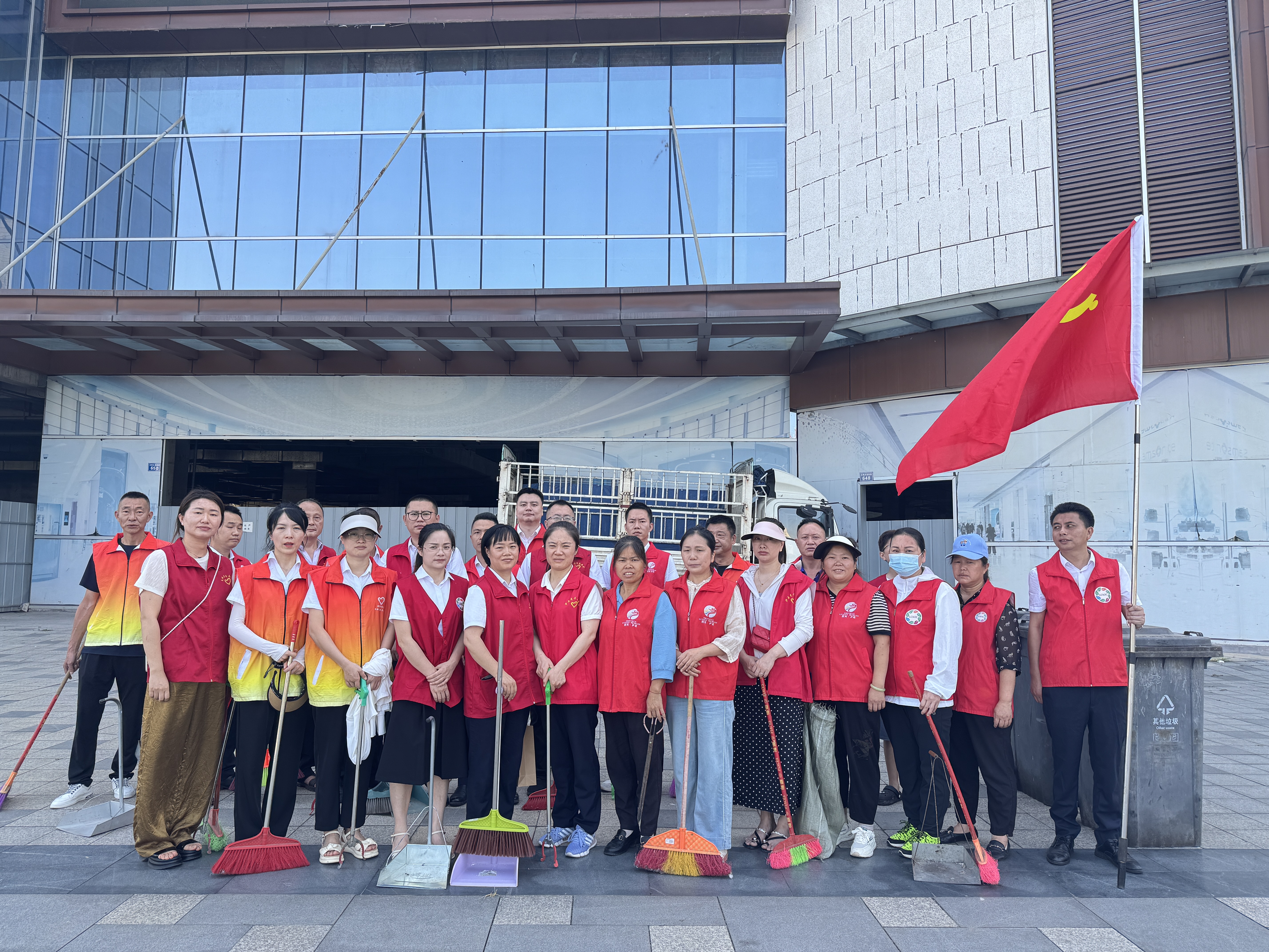 活動伊始,朝陽社區(qū)黨委書記對活動背景與意義進行深入闡述,并向匯興集團黨員同志的積極響應(yīng)致以誠摯謝意。隨后,全體人員跟隨黨旗,來到打掃區(qū)域。根據(jù)區(qū)域特性分為兩組,一組負責友豪商圈外圍環(huán)境清理,另一組專注商圈內(nèi)部清潔工作?;顒又?,黨員志愿者們手持掃帚、鏟子等工具,仔細清理路面垃圾、衛(wèi)生死角。經(jīng)過大家努力,臟亂的友豪商圈內(nèi)部環(huán)境得到有效清理。